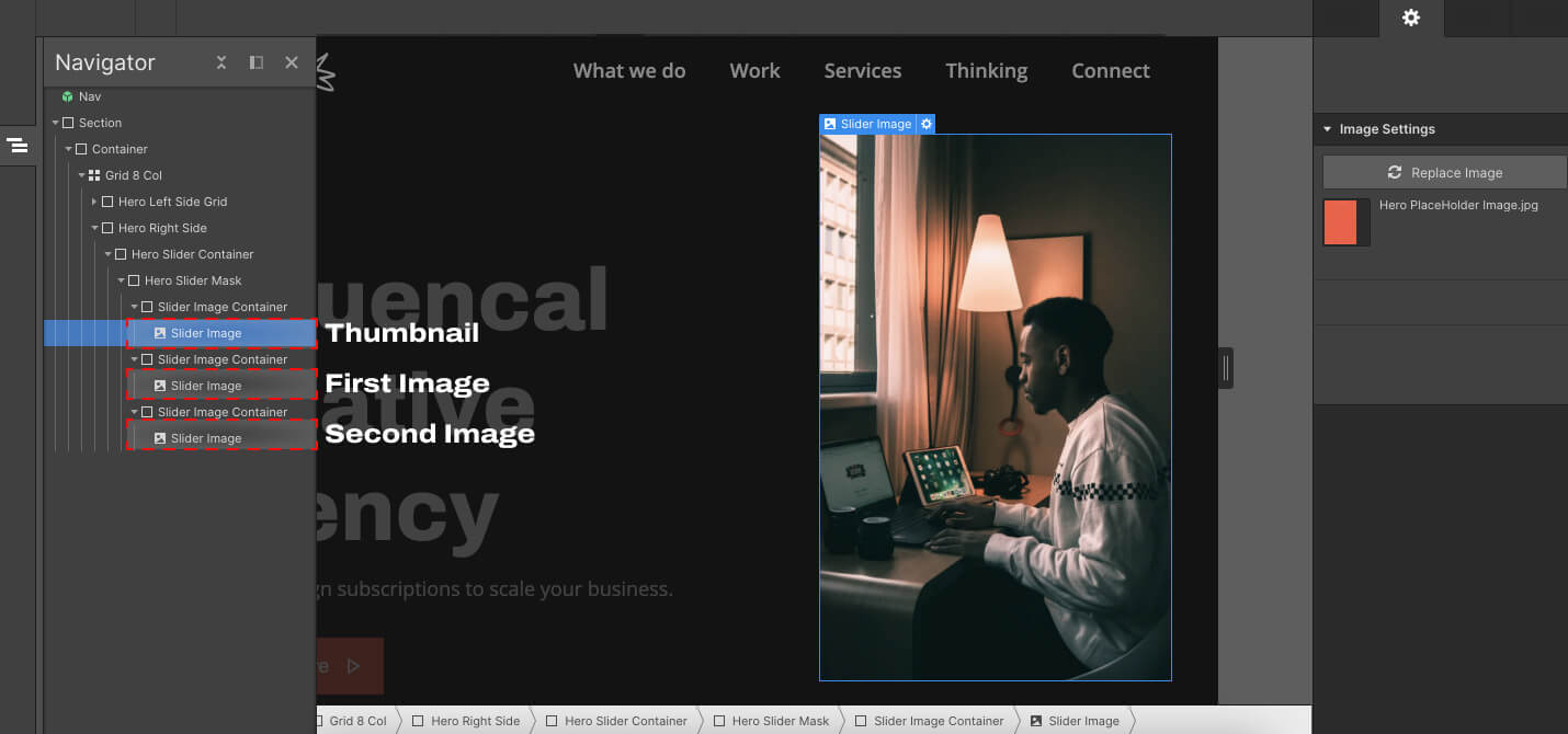 First go to the hero section, Expand the " Slider Image Container " and you will see three images. The first image is the placeholder (thumbnail) the second and the third are the images you want to change.